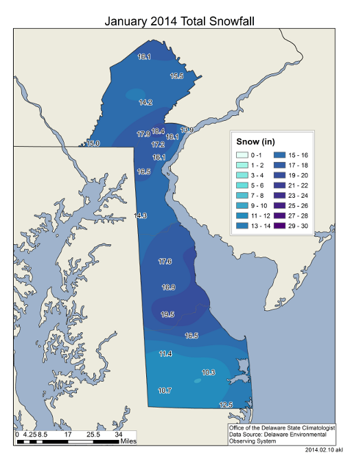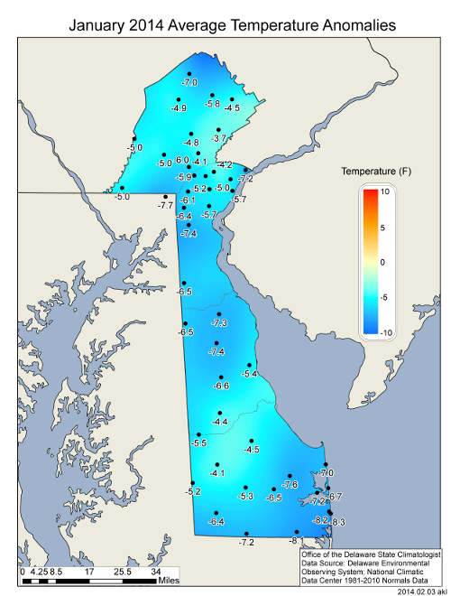 Delaware’s Climate during January 2014 was characterized by colder than normal temperatures and below normal precipitation values. Although total precipitation was below normal across the State, 2014 ranked as the 4th snowiest January since records began in 1948.