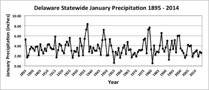 - Figure 2. Delaware statewide mean Janaury precipitation (inches) 1895-2014.