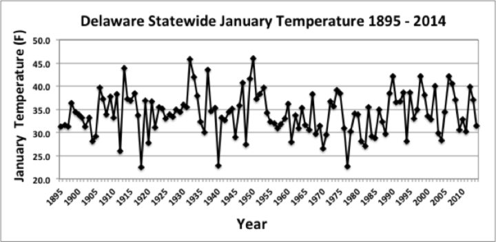 - Figure 1. Delaware statewide mean January temperature (°F) 1895-2014.