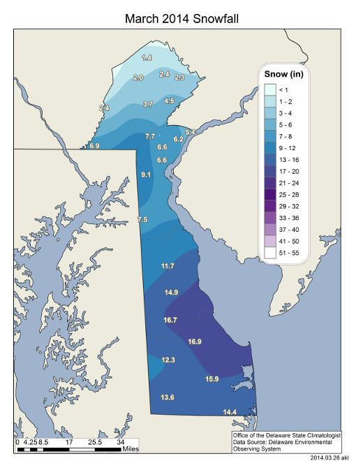 - Figure 3. Spring (March) 2014 snowfall totals based upon DEOS station data.