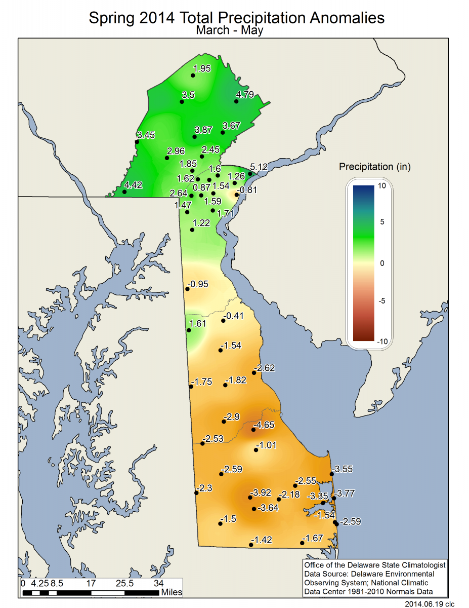 Preliminary data indicates that Delaware experienced its second cooler than normal spring in a row in 2014. The Statewide mean spring temperature of 52.6°F was 0.8°F below the 1981-2010 normal of 53.4°F (Figure 1). Spring 2014 was the coolest spring in the last nine years (since 2005).