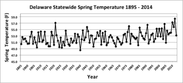 - Figure 1. Delaware statewide mean spring temperature (°F) 1895-2014.
