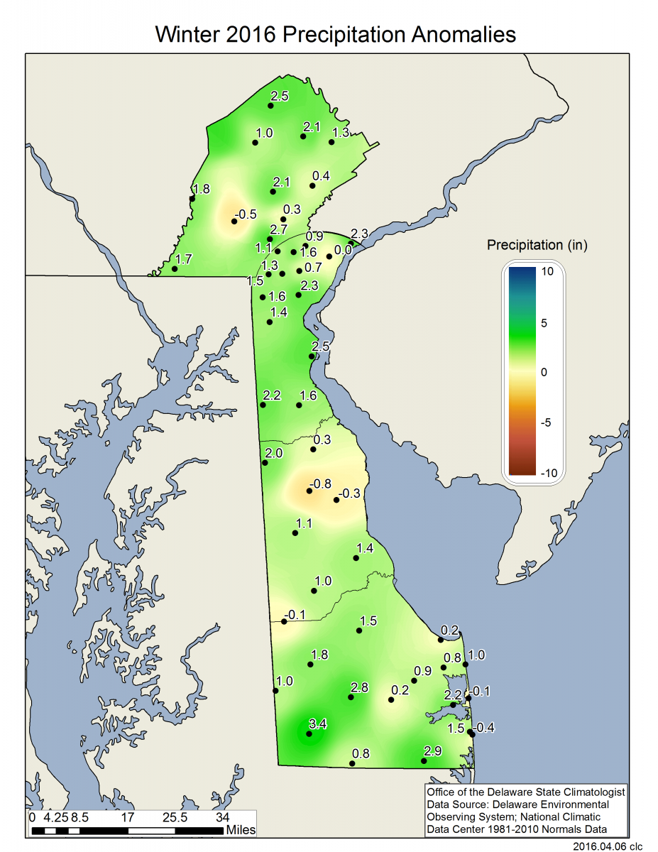 - Figure 4. Winter 2015 – 2016 precipitation departures (inches) from the 1981-2010 mean based upon DEOS station data.