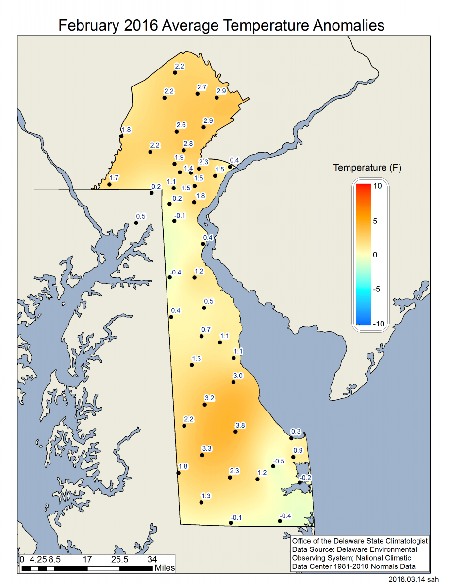 Preliminary data indicates that the statewide average temperature in February was 38.6°F; this was 2.1°F above the 1981-2010 normal of 36.5°F (Figure 1). February 2016 was 12.5°F warmer than February 2015, which was one of the coldest ever recorded across the First State.