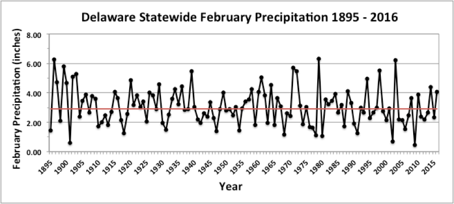 - Figure 2. Delaware statewide February precipitation (inches) 1895-2016. Red line indicates 1981-2010 normal.