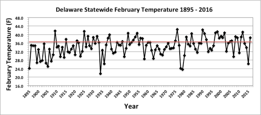 - Figure 1. Delaware statewide mean February temperature (°F) 1895-2016. Red line indicates 1981-2010 normal.