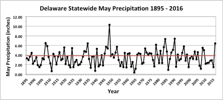 - Figure 2. Delaware statewide May precipitation (inches) 1895-2016. Red line indicates 1981-2010 normal.