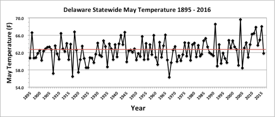 - Figure 1. Delaware statewide mean May temperature (°F) 1895-2016. Red line indicates 1981-2010 normal.