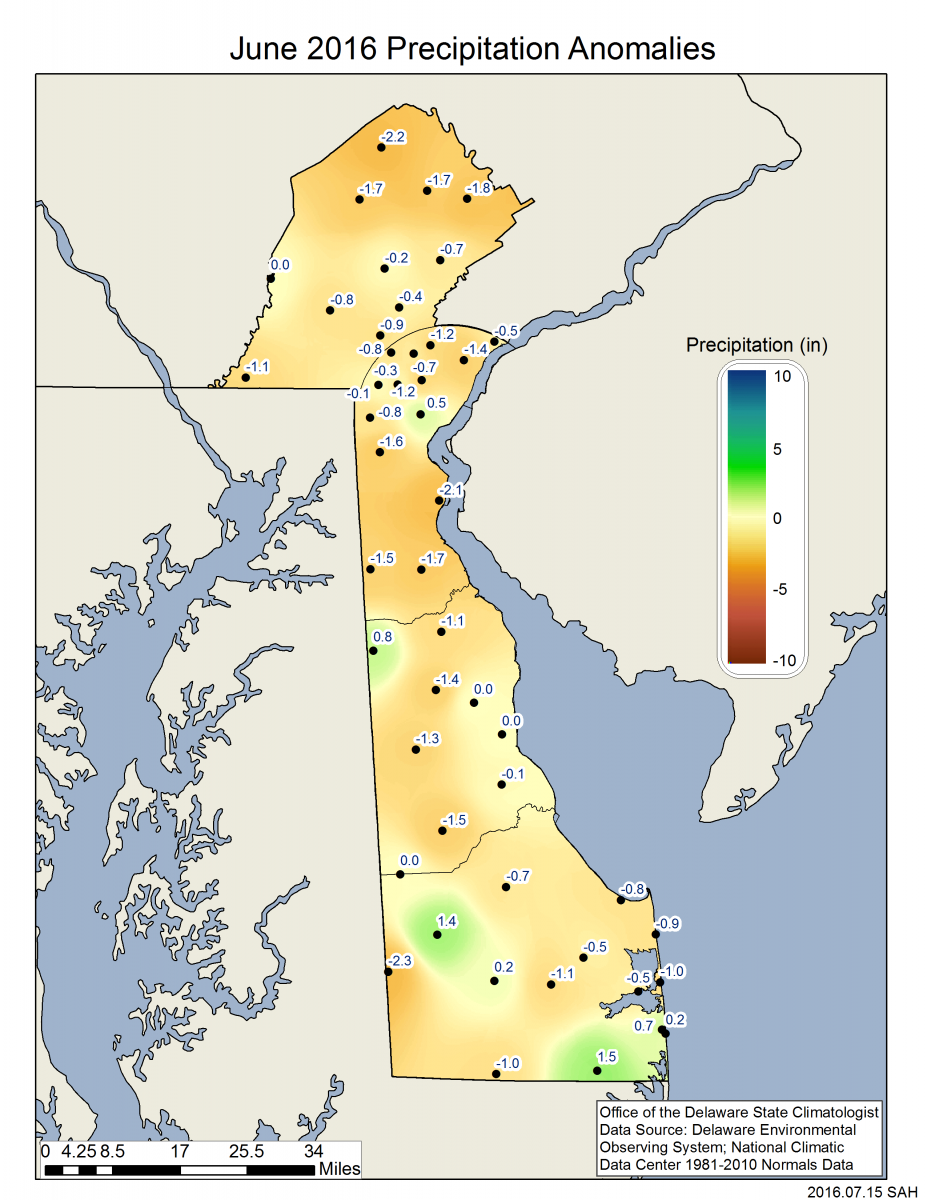 Delaware’s statewide precipitation for June 2016 averaged 3.51 inches, 0.22 inches below the 1981-2010 mean of 3.73 inches (Figure 2).