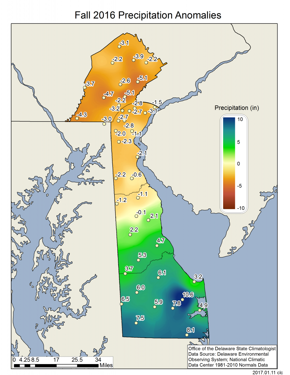 - Figure 4. Autumn 2016 precipitation departures (inches) from the 1981-2010 mean based upon DEOS station data.