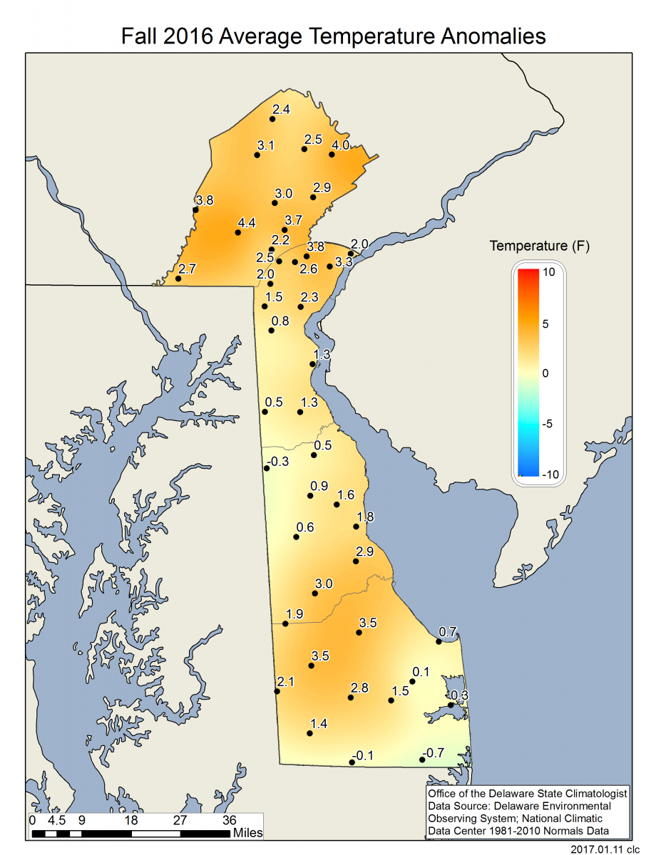 - Figure 3. Autumn 2016 average temperature departures (°F) from the 1981-2010 mean based upon DEOS station data.