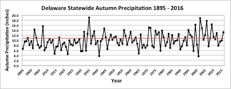 - Figure 2. Delaware statewide autumn precipitation (inches) 1895-2016. Red line indicates 1981-2010 normal.