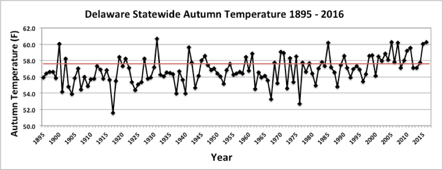 - Figure 1. Delaware statewide mean autumn temperature (°F) 1895-2016. Red line indicates 1981-2010 normal.