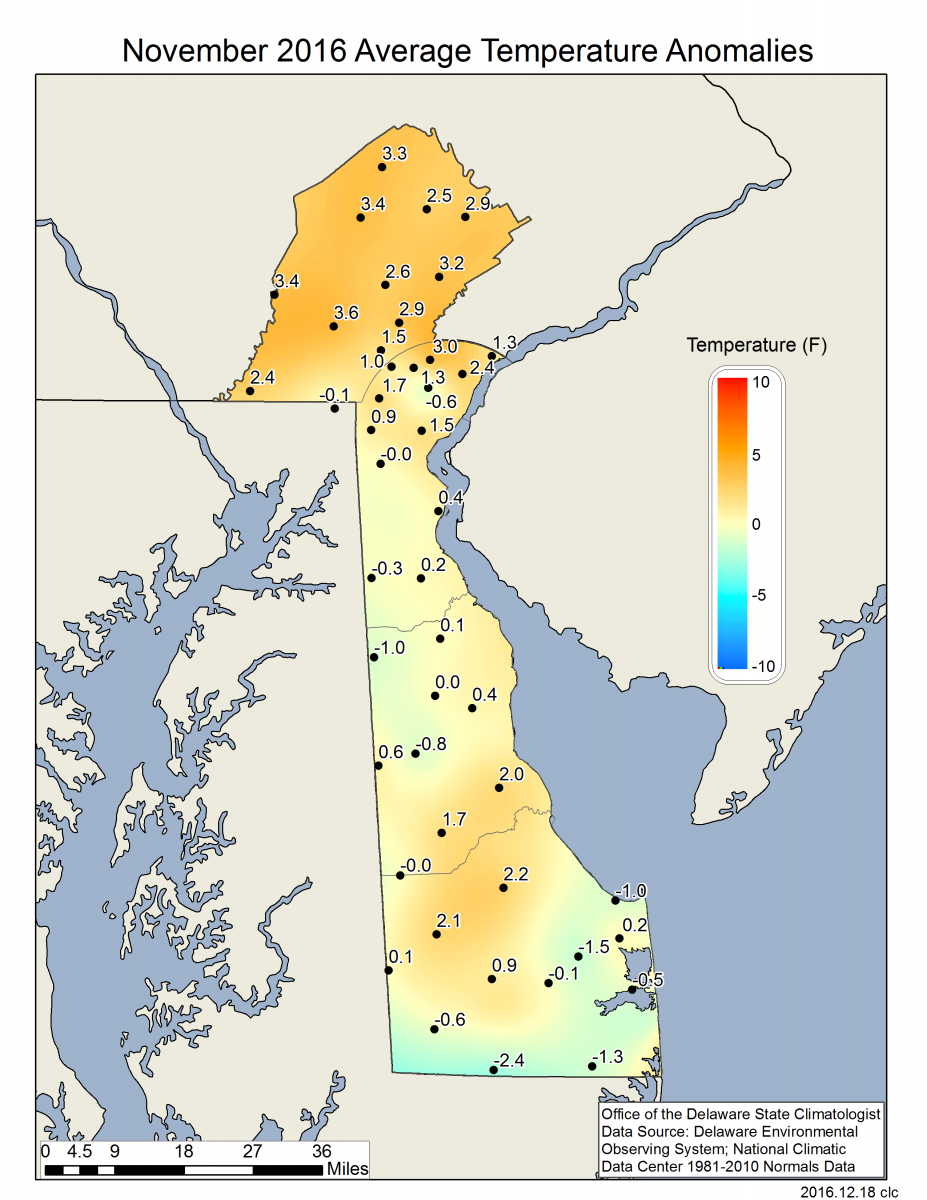 Preliminary data indicates that the statewide average temperature in November was 48.7°F, 1.1°F above the 1981-2010 normal of 47.6°F (Figure 1). November was the fifth month in a row with temperatures appreciably above normal across the First State.