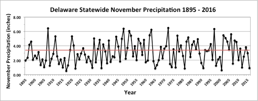 - Figure 2. Delaware statewide November precipitation (inches) 1895-2016. Red line indicates 1981-2010 normal.