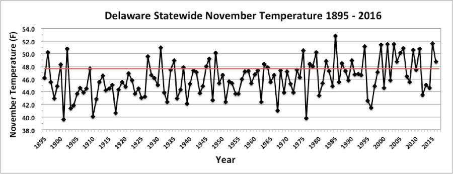 - Figure 1. Delaware statewide mean November temperature (°F) 1895-2016. Red line indicates 1981-2010 normal.