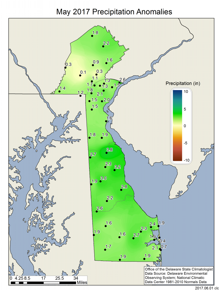 Delaware’s statewide precipitation for May 2017 averaged 5.92 inches, 2.06 inches above the 1981-2010 mean (Figure 2). May 2017 was only the second of the last eight months with above normal precipitation across the First State.