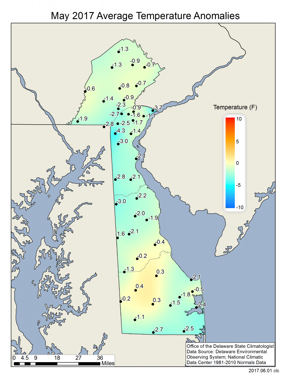 - Figure 3. May 2017 average temperature departures (°F) from the 1981-2010 mean based upon DEOS station data.