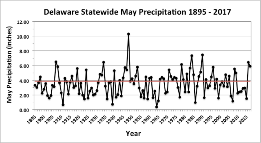 - Figure 2. Delaware statewide May precipitation (inches) 1895-2017. Red line indicates 1981-2010 normal.