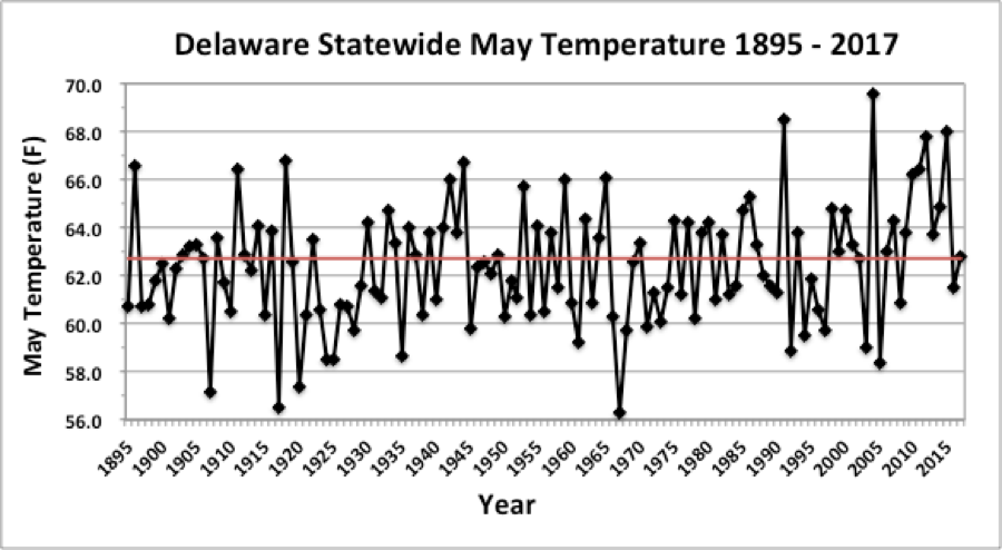 - Figure 1. Delaware statewide mean May temperature (°F) 1895-2017. Red line indicates 1981-2010 normal.