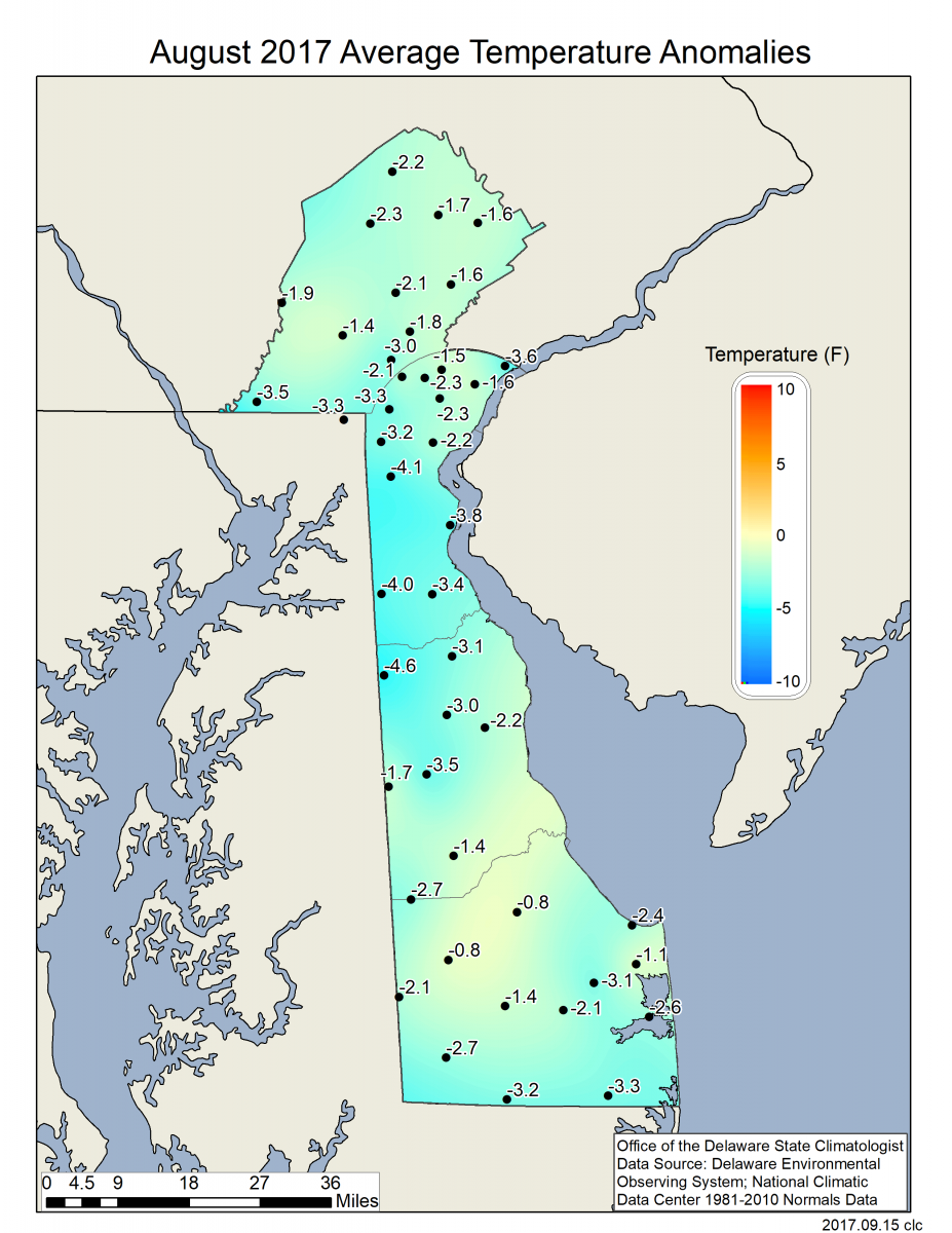 Preliminary data indicates that the statewide average temperature in August was 74.2°F; this was 0.7°F below the 1981-2010 normal of 74.9°F (Figure 1). August 2017 was the first month of the summer season to register below normal temperatures.