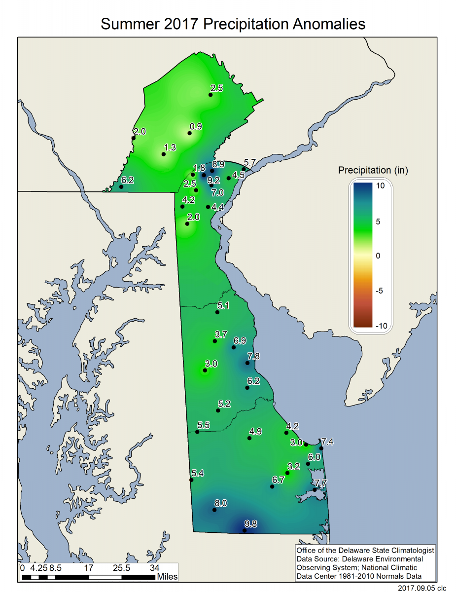 - Figure 4. Summer 2017 precipitation departures (inches) from the 1981-2010 mean based upon DEOS station data.