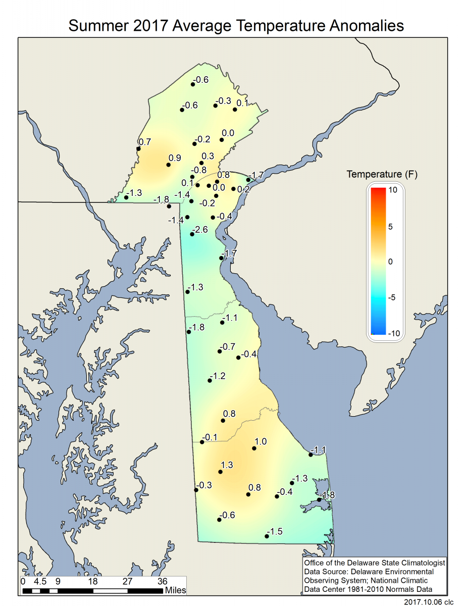 - Figure 3. Summer 2017 average temperature departures (°F) from the 1981-2010 mean based upon DEOS station data.