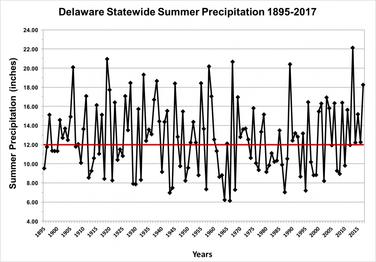 - Figure 2. Delaware statewide summer precipitation (inches) 1895-2017. Red line indicates 1981-2010 normal.