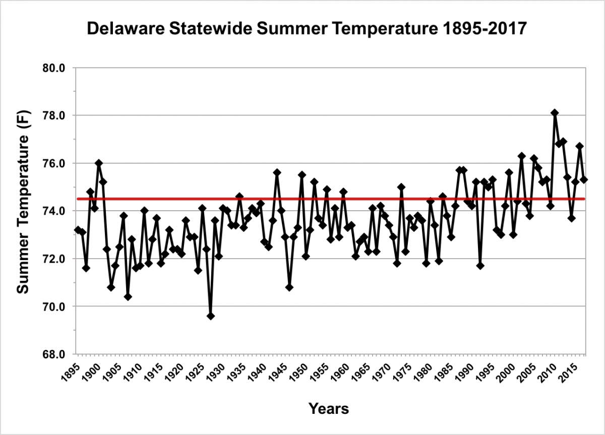 - Figure 1. Delaware statewide mean summer temperature (°F) 1895-2017. Red line indicates 1981-2010 normal.