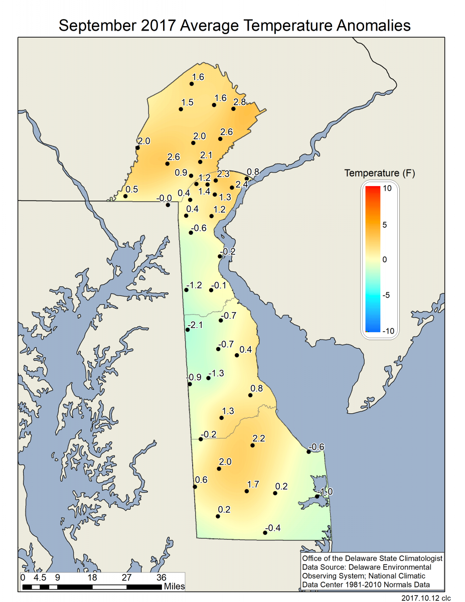 - Figure 3. September 2017 average temperature departures (°F) from the 1981-2010 mean based upon DEOS station data.