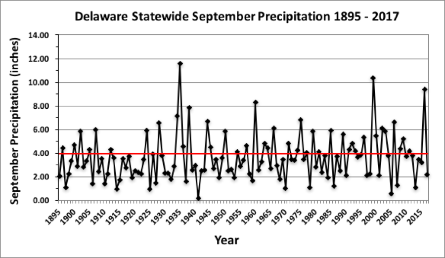 - Figure 2. Delaware statewide September precipitation (inches) 1895-2017. Red line indicates 1981-2010 normal.