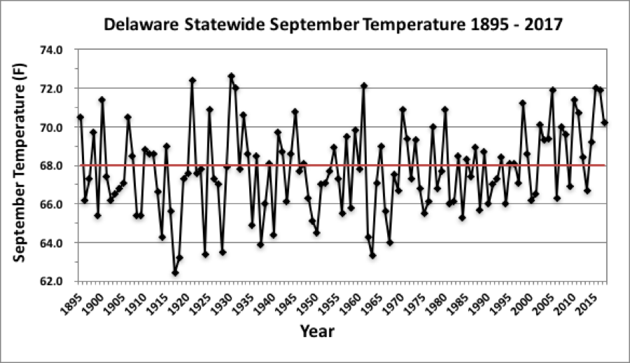 - Figure 1. Delaware statewide mean September temperature (°F) 1895-2017. Red line indicates 1981-2010 normal.