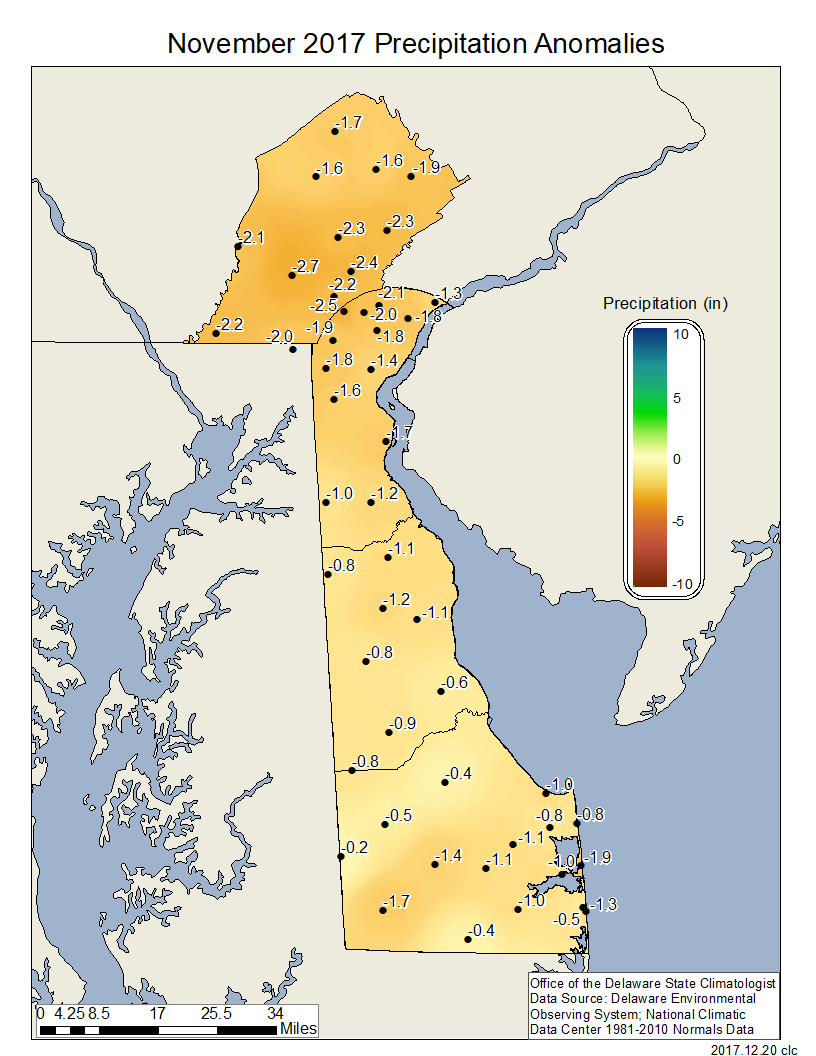 Delaware’s statewide precipitation for November 2017 averaged 2.01 inches, 1.39 inches below the 1981-2010 mean (Figure 2), placing it in the driest one-third of Novembers since 1895.