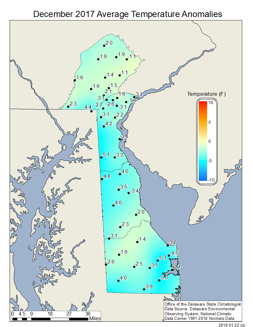Preliminary data indicates that the statewide average temperature in December was 36.7°F, which is 1.4°F below the 1981-2010 mean value of 38.1°F (Figure 1). This was Delaware’s coolest December since 2010.