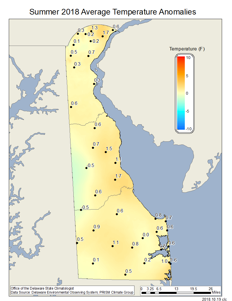 - Figure 3. summer 2018 average temperature departures (°F) from the 1981-2010 mean based upon DEOS station data.