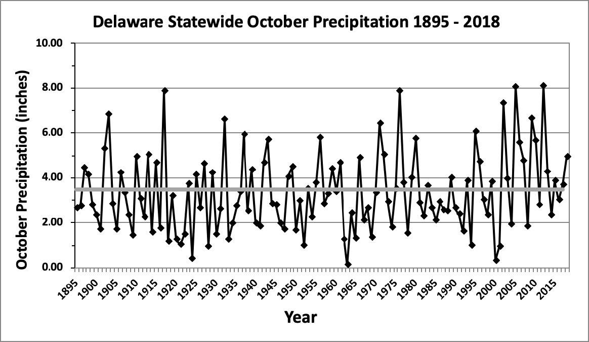- Figure 3. Delaware statewide October precipitation (inches) 1895-2018. Gray line indicates 1981-2010 normal.