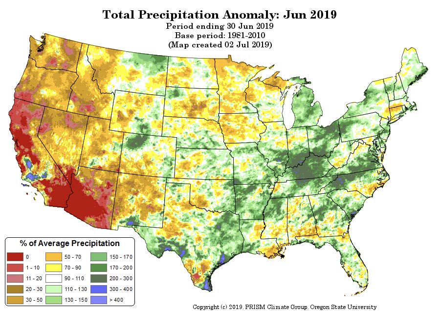 - Figure 6. Total Precipitation Anomaly for June 2019 (from the PRISM Climate Group, OSU).