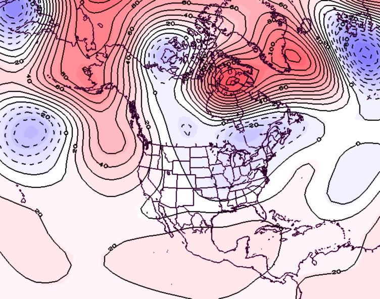 - Figure 7. 500 hPa geopotential height anomalies for June 2019. Negative (blue) anomalies indicate the presence of an anomalous jet stream trough while positive (red) height anomalies indicate the presence of anomalous ridging.