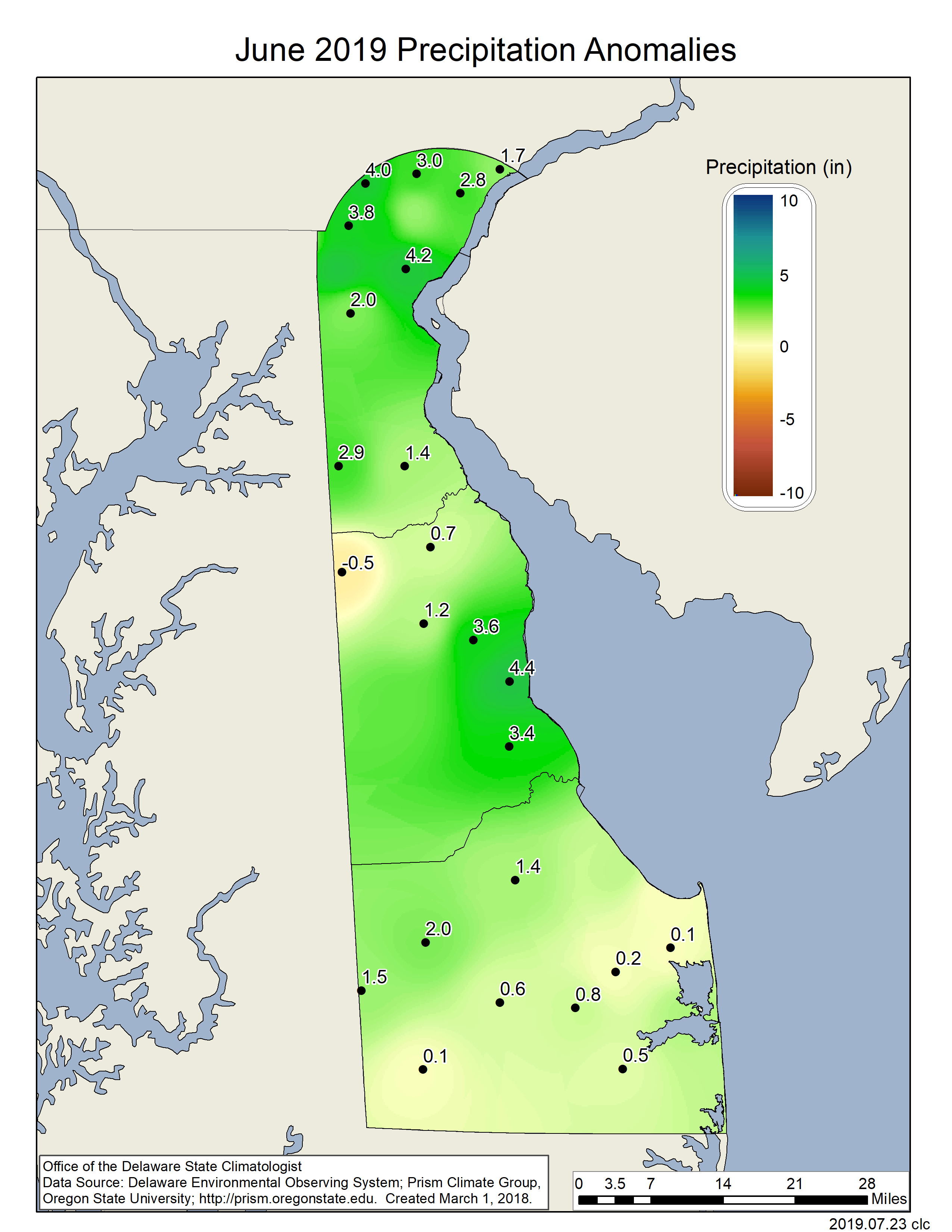 - Figure 4. June 2019 precipitation departures (inches) from the 1981-2010 mean based upon DEOS station data.