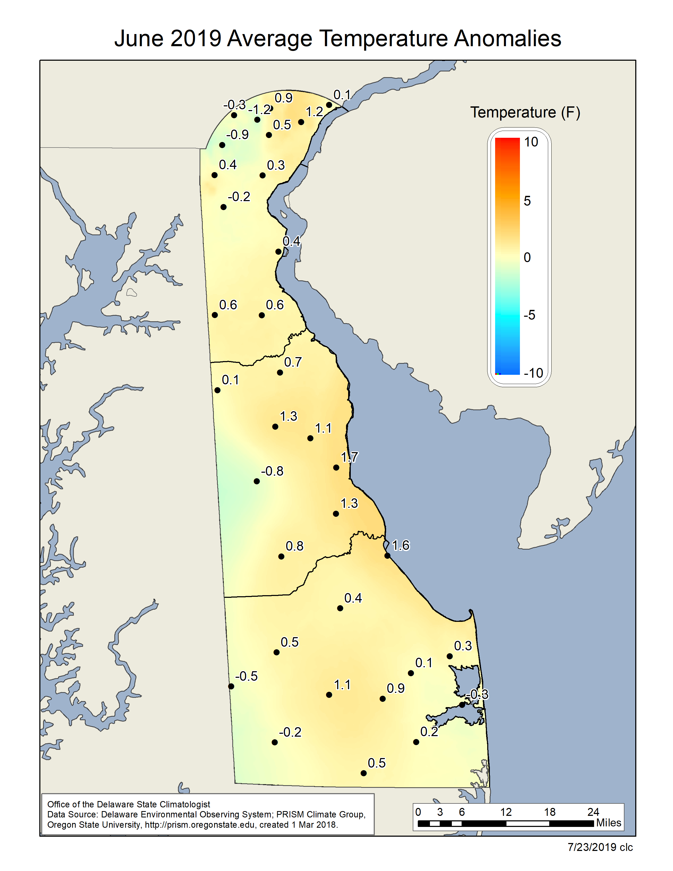 - Figure 3. June 2019 average temperature departures (°F) from the 1981-2010 mean based upon DEOS station data
