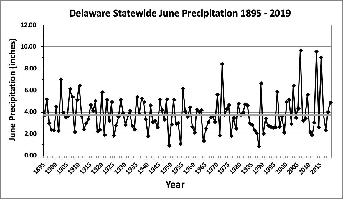 - Figure 2. Delaware statewide June precipitation (inches) 1895-2019. Gray line indicates 1981-2010 normal.