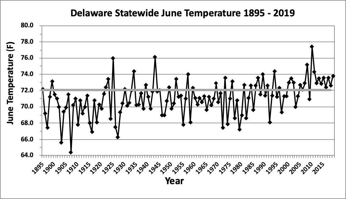 - Figure 1. Delaware statewide mean June temperature (°F) 1895-2019. Gray line indicates 1981-2010 normal.