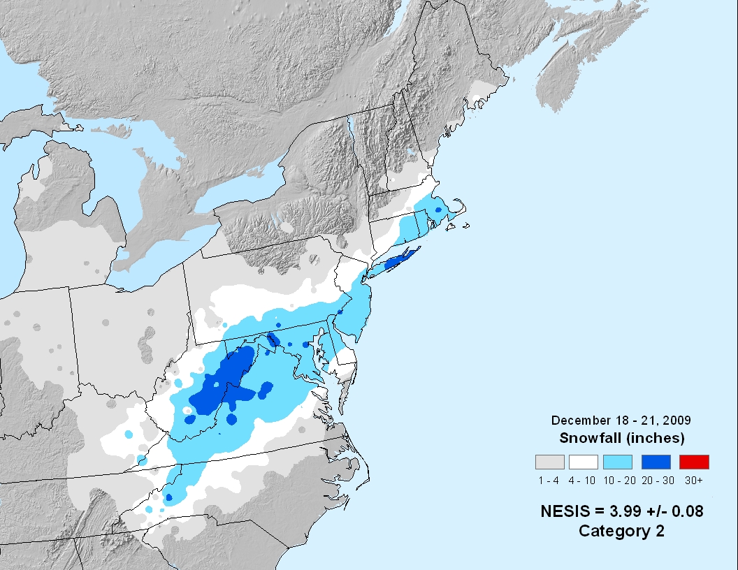 - Figure 2. December 18-21, 2009 Snowfall Map. Map courtesy NOAA’s NCEI – https://www.ncdc.noaa.gov/snow-and-ice/rsi/nesis.