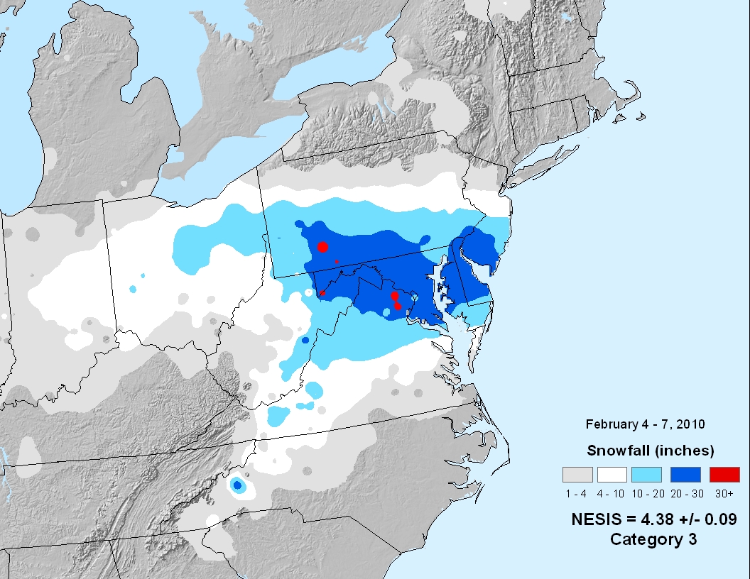- Figure 3. February 4-7, 2010 Snowfall Map. Map courtesy NOAA’s NCEI – https://www.ncdc.noaa.gov/snow-and-ice/rsi/nesis.
