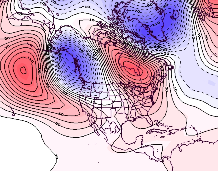 - Figure 7. 500 hPa geopotential height anomalies for January 2020. Negative (blue) anomalies indicate the presence of an anomalous jet stream trough while positive (red) height anomalies indicate the presence of anomalous ridging.