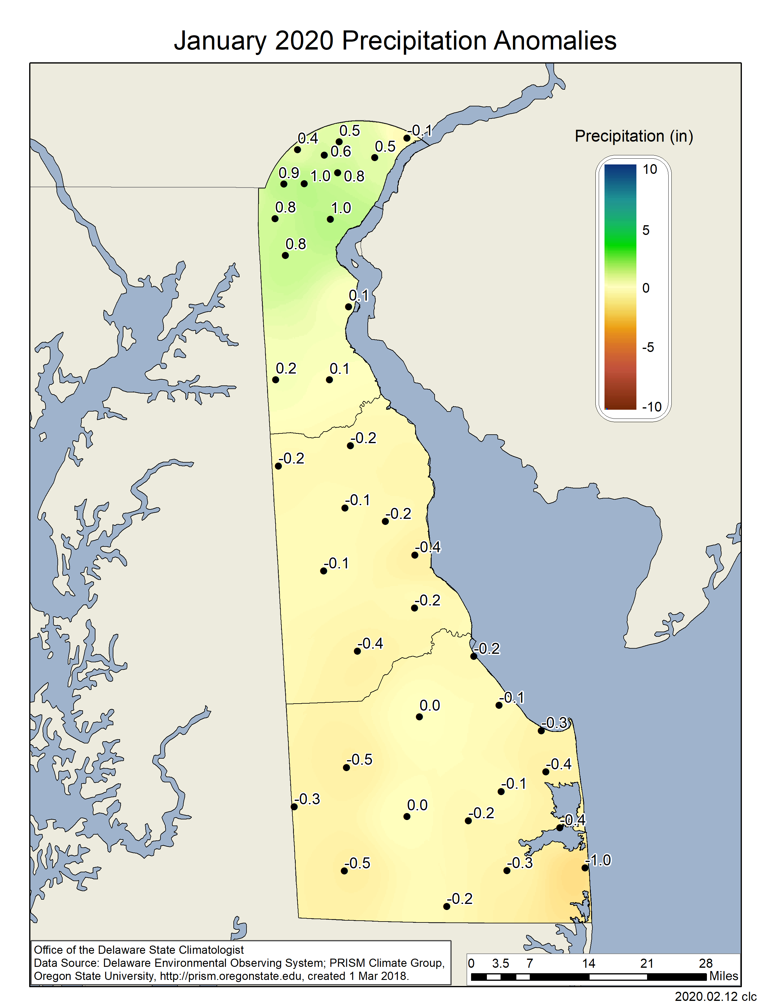 Delaware’s statewide precipitation for January 2020 averaged 3.20 inches, 0.12 inches below the 1981-2010 mean (Figure 2). This placed the January 2020 precipitation amount in the “normal” category for the month.
