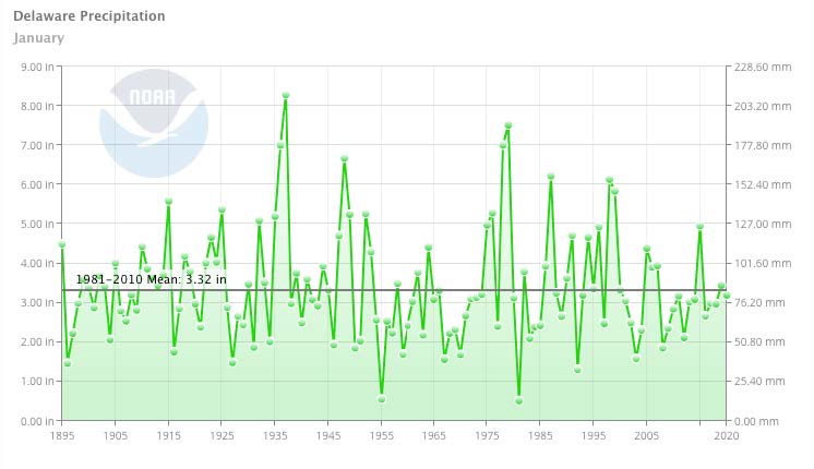 - Figure 2. Delaware statewide January precipitation (inches) 1895-2020. Gray line indicates 1981-2010 normal.