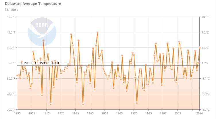 - Figure 1. Delaware statewide mean January temperature (°F) 1895-2020. Gray line indicates 1981-2010 normal.