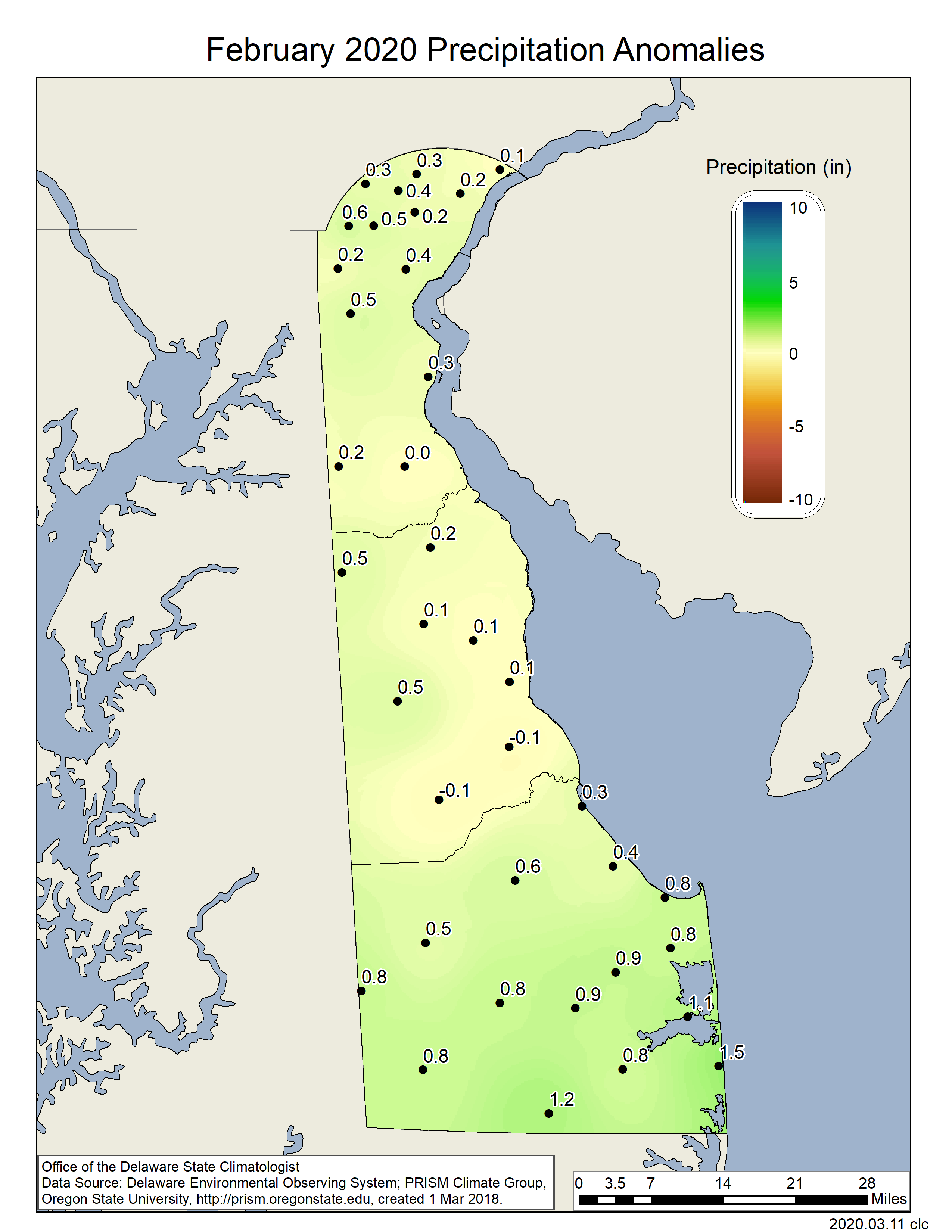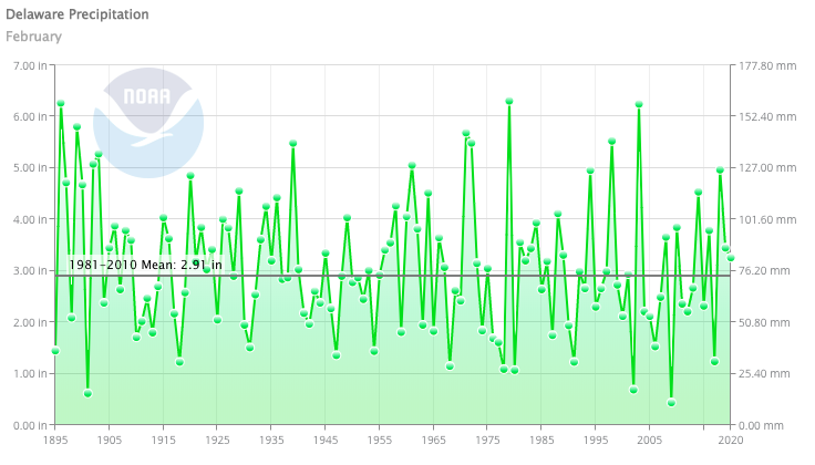 Delaware’s statewide precipitation for February 2020 averaged 3.26 inches, 0.35 inches above the 1981-2010 mean (Figure 2). This placed the February 2020 precipitation amount in the “normal” category for the month.