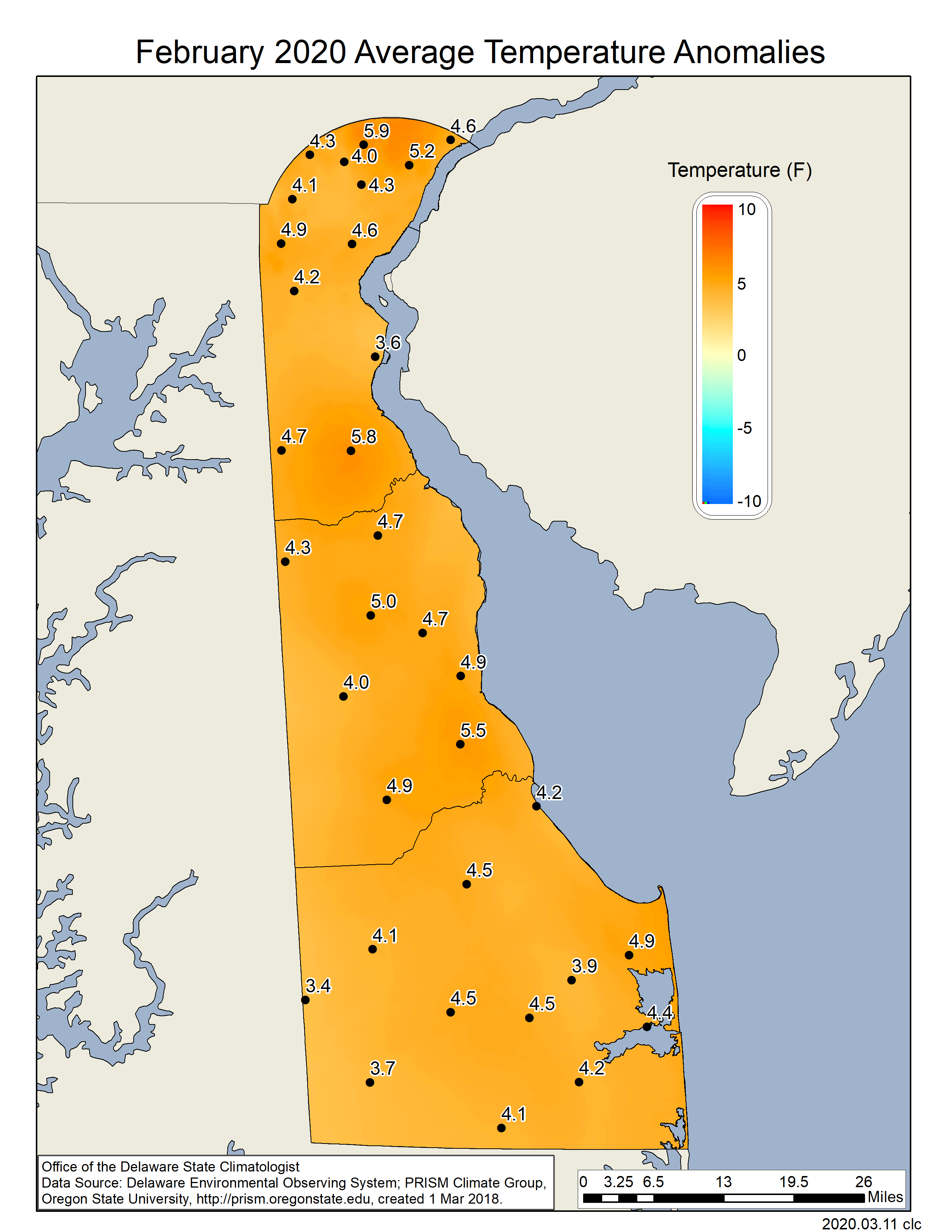 - Figure 3. February 2020 average temperature departures (oF) from the 1981-2010 mean based upon DEOS station data.